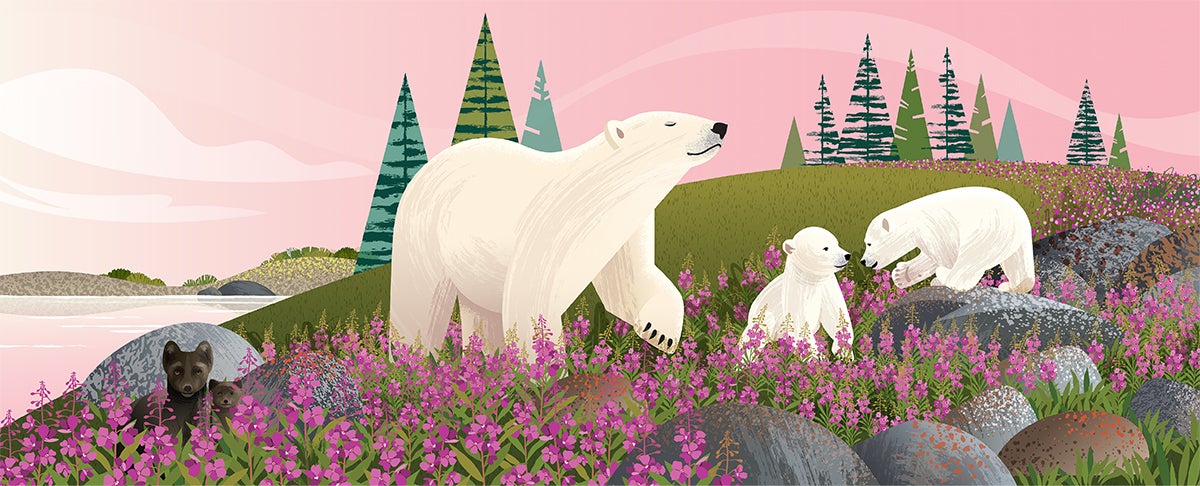 Polar Bear Plunge reflects Churchill, Manitoba, on the western shore of Hudson Bay. This is one of the southernmost areas polar bears live. Beautiful artwork and engaging signage will guide you through a full year in the life of a polar bear in Churchill’s tundra environment, from summering on the shore to heading to the ocean in spring. See a polar bear test the sea ice forming on Hudson Bay in the late fall, and snuggle in with a mother and her two cubs denning through the winter. Explore the connections between polar bears, plants, people, and the ocean they all depend on.