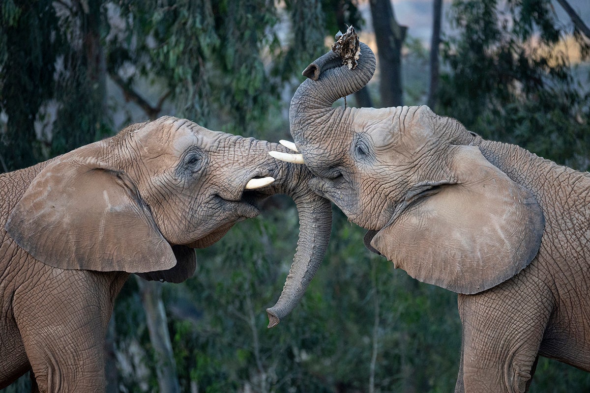As the sun rises over the rolling hills of the San Diego Zoo Safari Park, a herd of elephants is already on the move. The matriarch, Swazi, gets first choice of the abundant resources spread across her lushly planted habitats. Tagging along is her daughter Qinisa (Nisa), eager to enjoy the perks of mom being in the top spot. Next is second-in-command Ndlulamitsi (Ndlula), who keeps an eye on the others as she and her young son Umzula-Zuli (Zuli) head for a different pile of browse. The third-ranking female, Umngani, calmly follows along with her daughter Mkhaya, happy to take whatever the others leave behind. Umngani’s older daughter, Khosi, wants to hang out with Nisa, so she heads over to see if Swazi will let her join them for breakfast. Phakamile (Kami) eats by herself for a bit before deciding to join Nisa and Khosi. These interactions are the first of hundreds the eight elephants will experience as they spend their day together at Denny Sanford Elephant Valley.